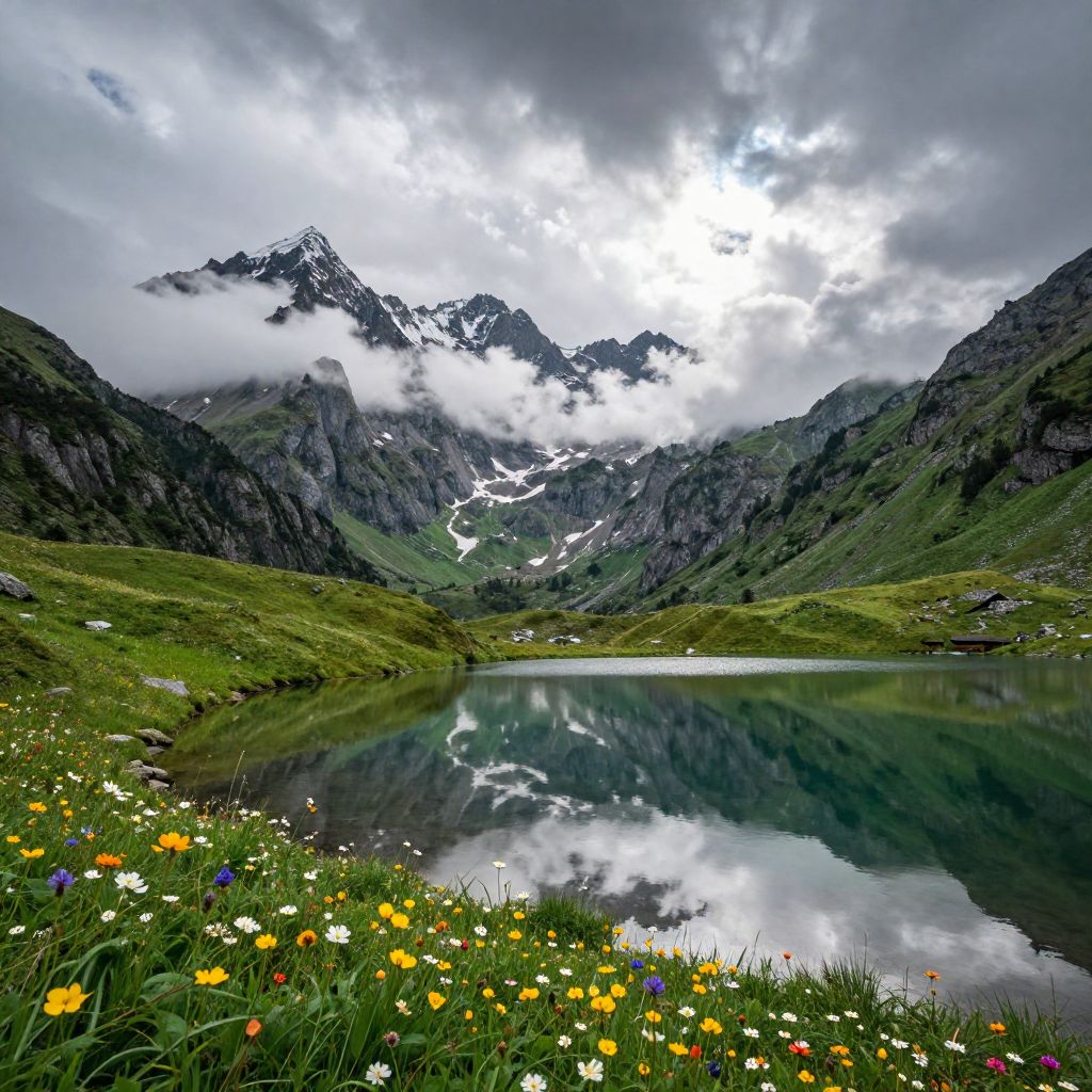 Ultra-detailed 4K image of a serene alpine mountain landscape featuring towering peaks partially covered by clouds, a tranquil lake perfectly reflecting the surrounding scenery, and vibrant wildflowers blooming along the shore. The lush green valley and the dramatic sky create a picturesque and awe-inspiring atmosphere, evoking a spirit of adventure in this pristine natural paradise.
