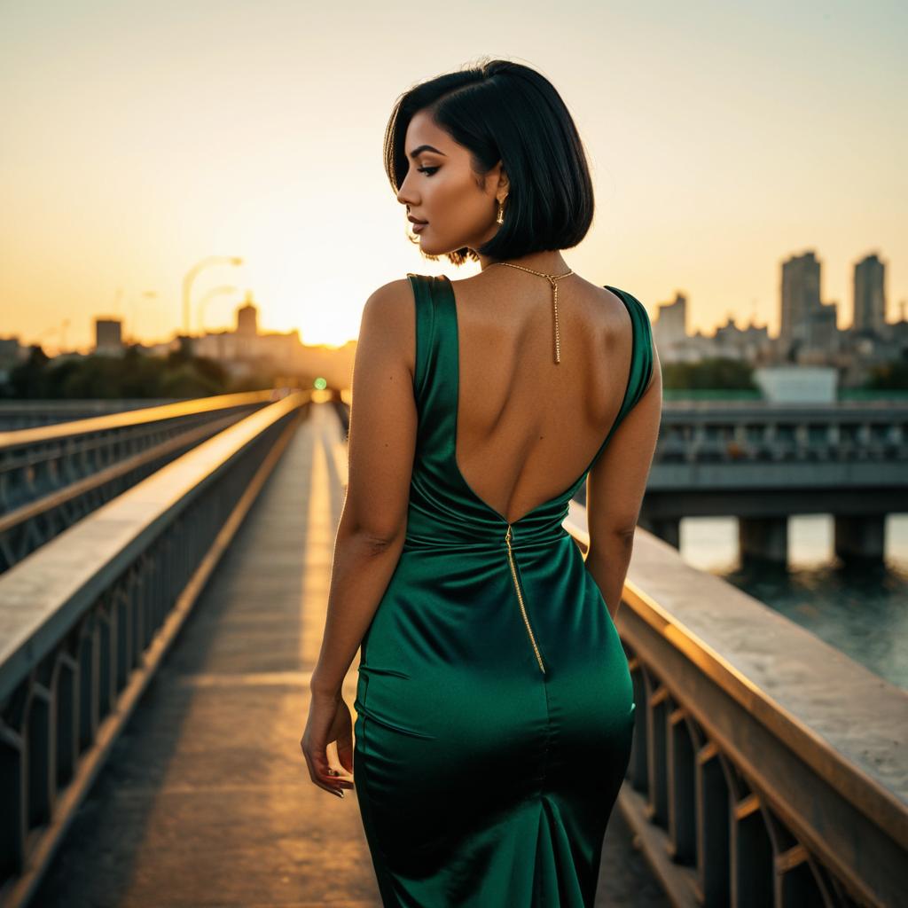 Fashion portrait of olive-skinned woman with sleek dark bob and dramatic eyeliner in a backless fitted dress, massive tits, standing on an urban bridge at golden hour, body turned away from the camera while looking back over her shoulder, soft warm sunset light, shallow depth of field, cinematic mood, dress in deep emerald green satin, subtle jewelry, glossy editorial photography
