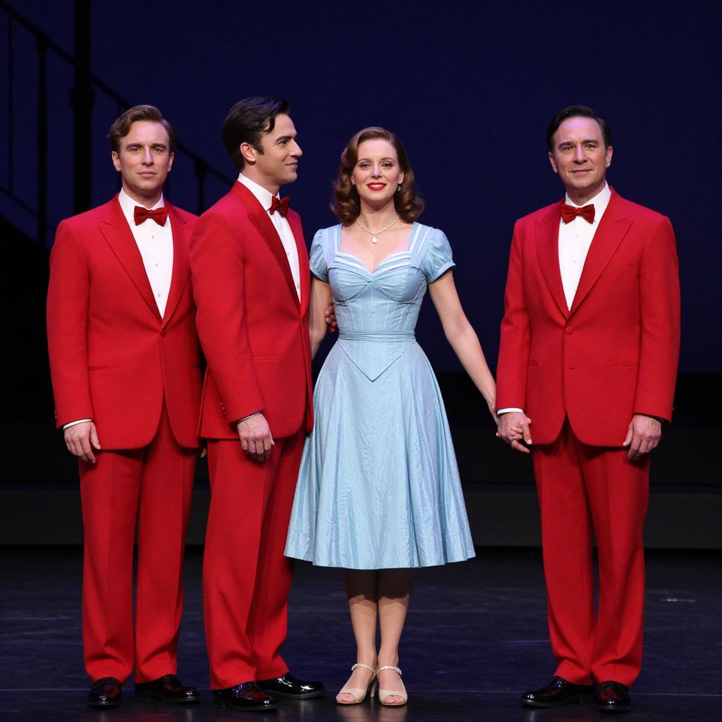 Photograph of a stage production: a woman in a light blue 1950s-style dress, holding hands with three men in red tuxed