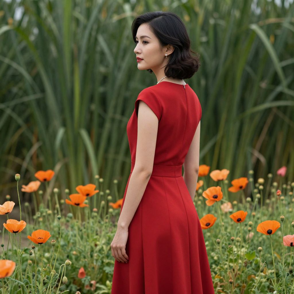 Elegant woman in a vibrant red dress stands gracefully amidst tall green foliage and blooming orange poppies, her back turned as she gazes into the distance, evoking a timeless sense of sophistication and natural beauty.