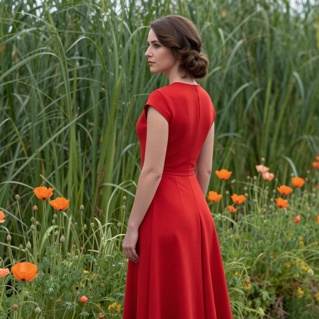 Photograph of a young woman with fair skin and dark brown, wavy hair in a low bun, standing in a lush garden. She faces away, showing her back in a vibrant red, knee-length dress with short sleeves. The background features tall, green grass and a bed of colorful poppies, including orange and yellow flowers. Her posture is slightly turned, with her right hand resting by her side. The greenery and flowers create a vibrant, natural setting, contrasting with her bold red dress. The image is bright and crisp, capturing a serene, elegant moment in nature.