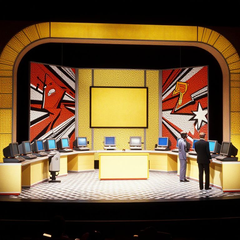 Roy Lichtenstein photo, interior, 1980s computer store, Broadway set design, stage design. Production photo,