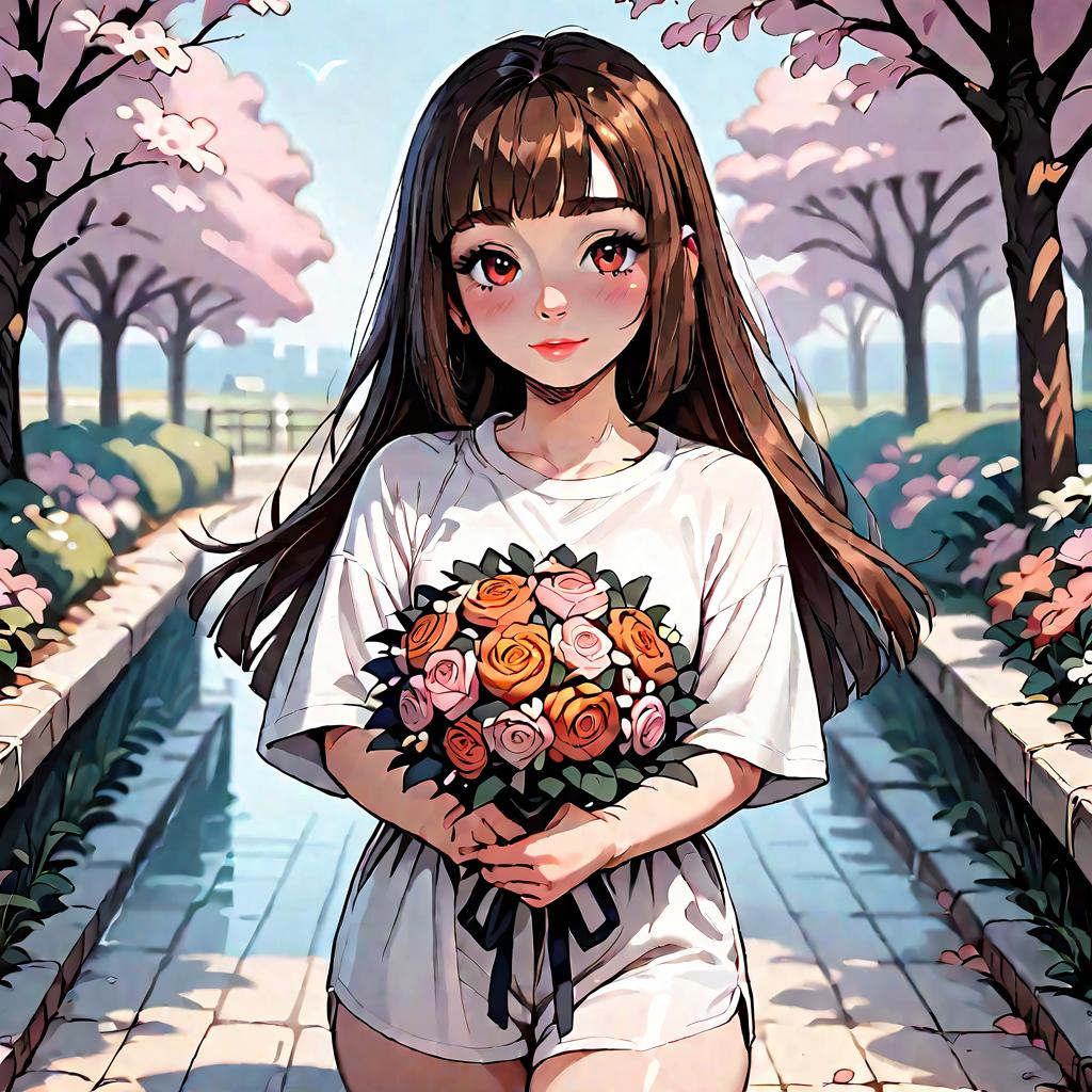 (score_9, score_8_up, score_7_up), ((1child girl)), mesugaki, fair_skin, hime cut, brown hair, thick eyebrows, gradient eyes, pink eyes, slit_pupils, expressive_clothes, thick_thighs, depth of field, from front, front view, wide_shot, standing, blush, shy, looking at viewer, oversized t-shirt, sandals, hand viewer the bouquet, holding_bouquet, in a park