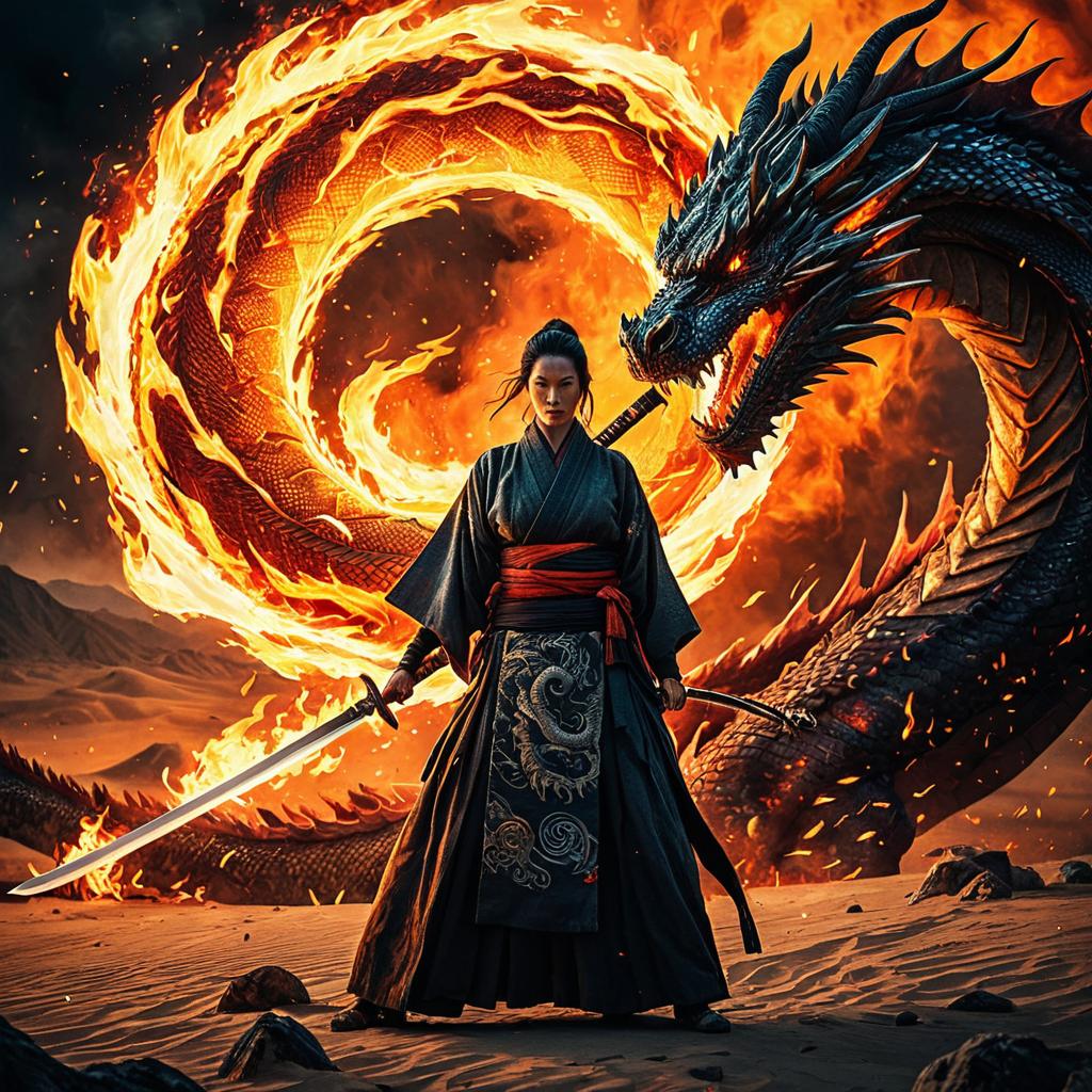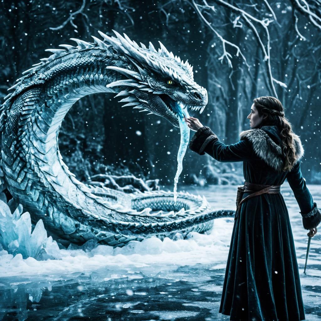 A female enchanter in a dark cloak with fur trim stands in a snowy, mystical environment, releasing powerful frost magic. She faces a large, detailed ice serpent with sharp teeth and scales coiled protectively around her, set against a backdrop of snow-covered trees and a shadowy archway.