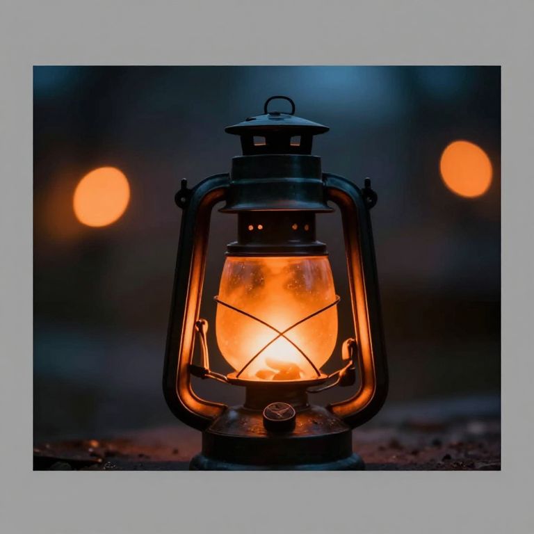 Photograph of a vintage black metal lantern with a glowing orange flame inside, centered in the frame. The lantern has a glass enclosure with crisscrossing metal supports. The background is dark and blurred, with two warm, out-of-focus orange bokeh lights on either side, creating a cozy, nighttime atmosphere. The lantern sits on a rough, dark surface, and the image has a soft focus, emphasizing the lantern's warm light against the cool, dark background. The photograph has a square format with a light gray border.