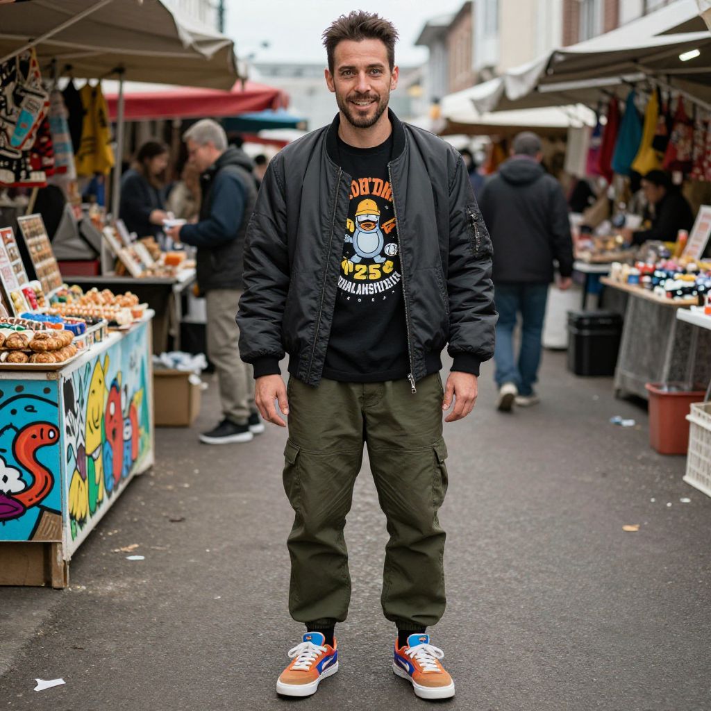 A man, charcoal bomber jacket, graphic tee, olive green joggers, vibrant skate sneakers, vibrant street murals, bustling market stalls, joyful expression, cinematic style. Man has masculine face and piercing eyes