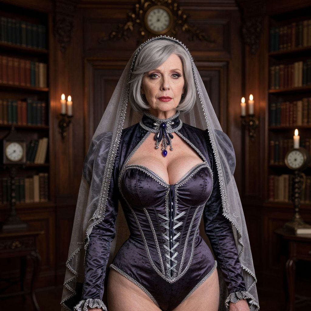 Photograph of a mature woman with short, silver-gray hair, wearing an elaborate, dark purple corset with intricate silver embroidery, and a sheer, lace veil adorned with matching silver trim. Her corset accentuates her ample cleavage and she wears long, lace-trimmed gloves. She has pale skin and blue eyes, with a serious expression. The background features a dimly-lit, wooden library with bookshelves on either side and two candle sconces emitting soft light. An ornate clock is centered on the dark wooden wall behind her, adding to the vintage, Gothic atmosphere.