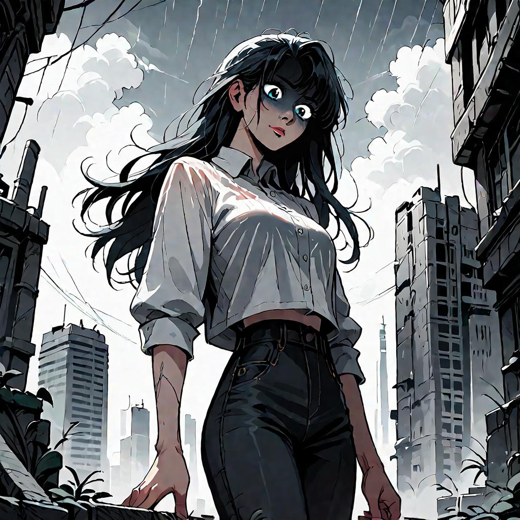 Score_9, score_8_up, score_7_up, source_anime, post-apocalypse, rooftop, (skyscraper), ruins, overcast, rain, cloudy sky, (1girl, poncho, female focus), looking down, long hair, worried, cowboy shot, standing, detailed eyes, [shaded face], dilapidated cityscape, NO_LORA