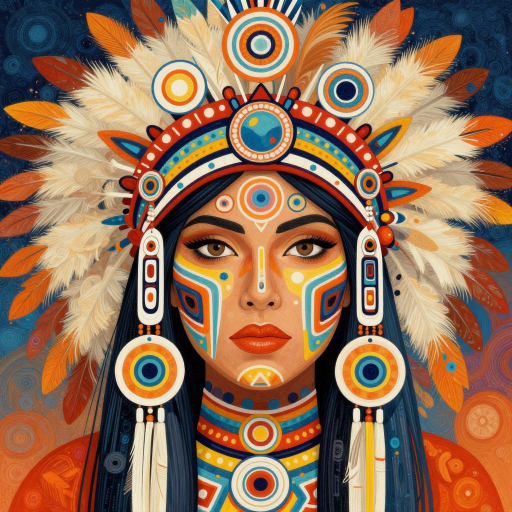 Digital artwork of a Native American woman with orange and white feather headdress, colorful face paint, and intricate headpiece, against a blue and orange abstract