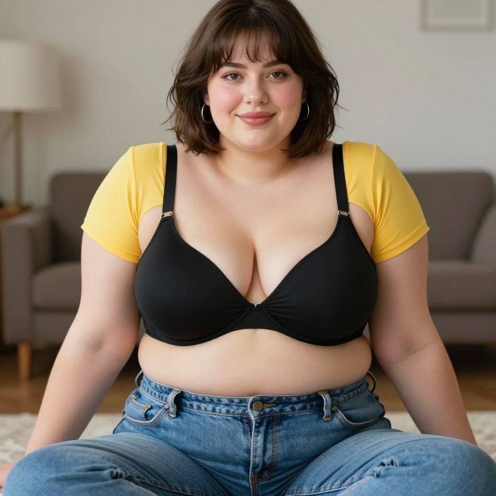 (masterpiece:1.2, best quality:1.2, beautiful, high quality, highres:1.1, aesthetic), detailed, extremely detailed, ambient soft lighting, 4K, perfect eyes, perfect face, perfect lighting, 1girl, bangs, black bra, blue pants, blurry, blurry background, blush, bra, breasts, brown eyes, brown hair, cleavage, denim, earrings, fat, huge breasts, jeans, jewelry, large breasts, looking at viewer, midriff, navel, open mouth, pants, plump, shirt, short hair, short sleeves, sitting, smile, solo, thick arms, thick eyebrows, thick thighs, thighs, underwear, yellow shirt