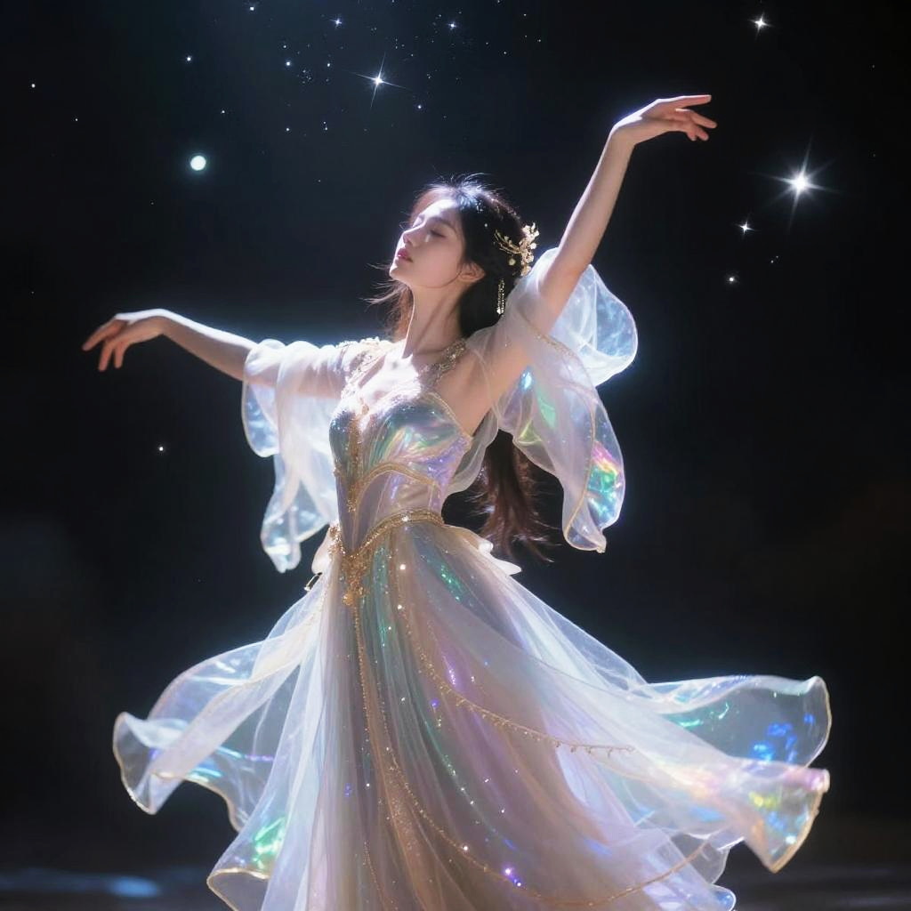 Photograph of a graceful Asian woman dancing on a dark stage, illuminated by soft, sparkling stage lights. She wears a flowing, translucent white gown with iridescent sequins and gold embroidery, featuring puffed sleeves and a fitted bodice. Her long, dark hair is adorned with a small, gold floral crown. She poses with one arm extended upwards and the other outwards, her body slightly tilted. The background is black, with star-like light effects enhancing the ethereal atmosphere. Her expression is serene and focused, capturing a moment of elegant movement.