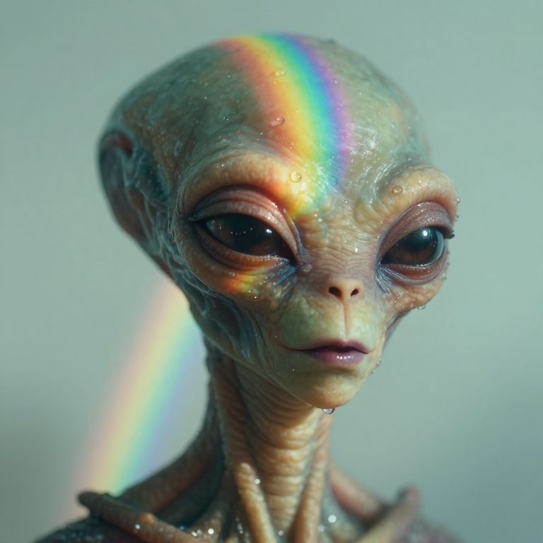 CynthiaPortrait, This image captures Mac the alien’s face bathed in natural light, partially obscured by a vivid, rainbow- light refraction, Mac’s expression is serene, lips slightly parted, with droplets of water glistening on mac the alien’s skin, adding a fresh, dewy appearance, The interplay between the prismatic light beam, which runs diagonally across the frame, and the soft highlights on Mac’s face creates a dynamic visual effect that feels both surreal and immersive, The backdrop is a simple, light teal that enhances the contrast of the bright spectrum of colors, reinforcing the ethereal and artistic atmosphere of the photograph