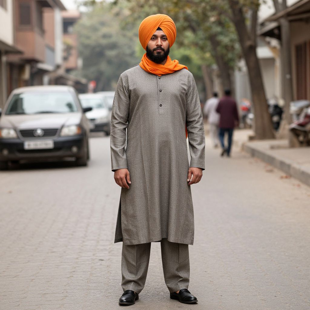 Sharara Suits Costume, man in turban standing on street with orange scarf