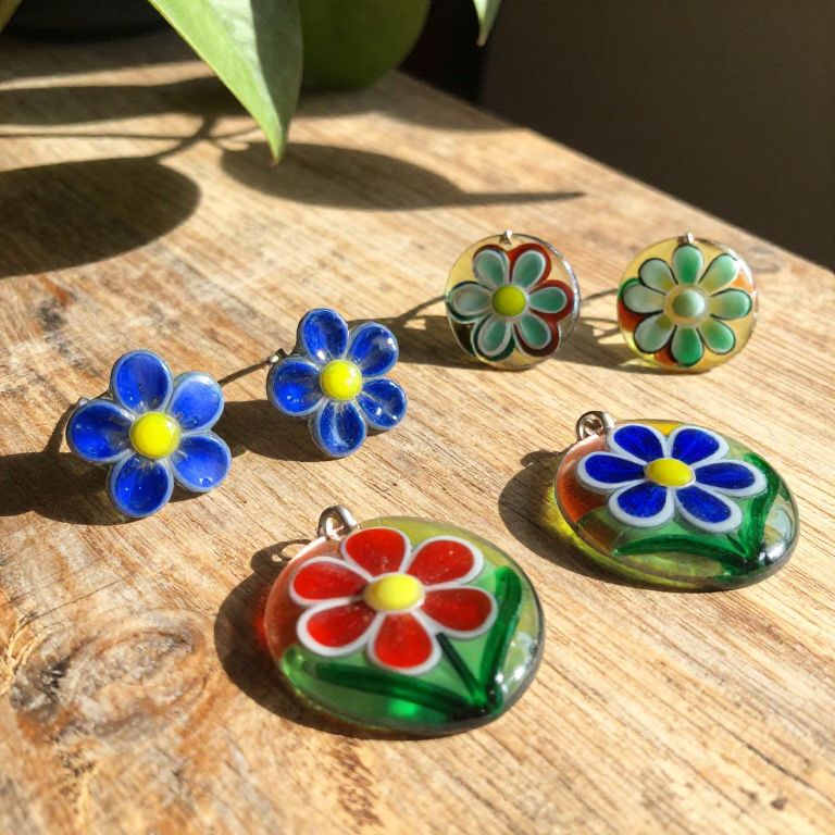 Brincos made of colorful fused glass, whimsical floral patterns with vibrant hues of red, blue and green, arranged on a rustic wooden table with natural sunlight filtering through nearby leaves.