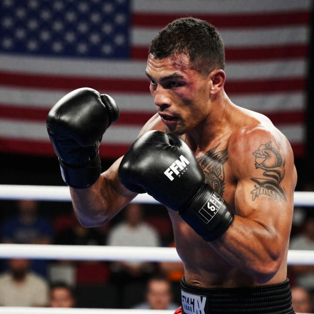 Photograph of two muscular, shirtless men in an intense wrestling match. Bald man on left, dark-haired man on right, both with blood on their arms. Bald man grabs dark-haired man's rope-tied arms. Dimly lit background. Forearms and rope in focus.