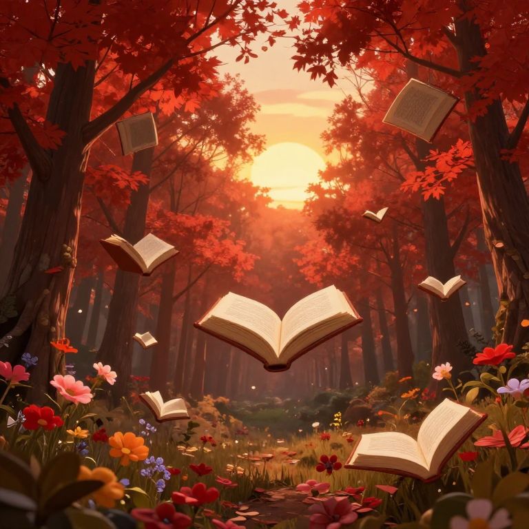 An enchanting digital illustration depicts a whimsical forest where books float gracefully among crimson trees, their pages blooming like flowers under the golden glow of a setting sun, creating a magical scene that blends surrealism with the warmth of autumn.