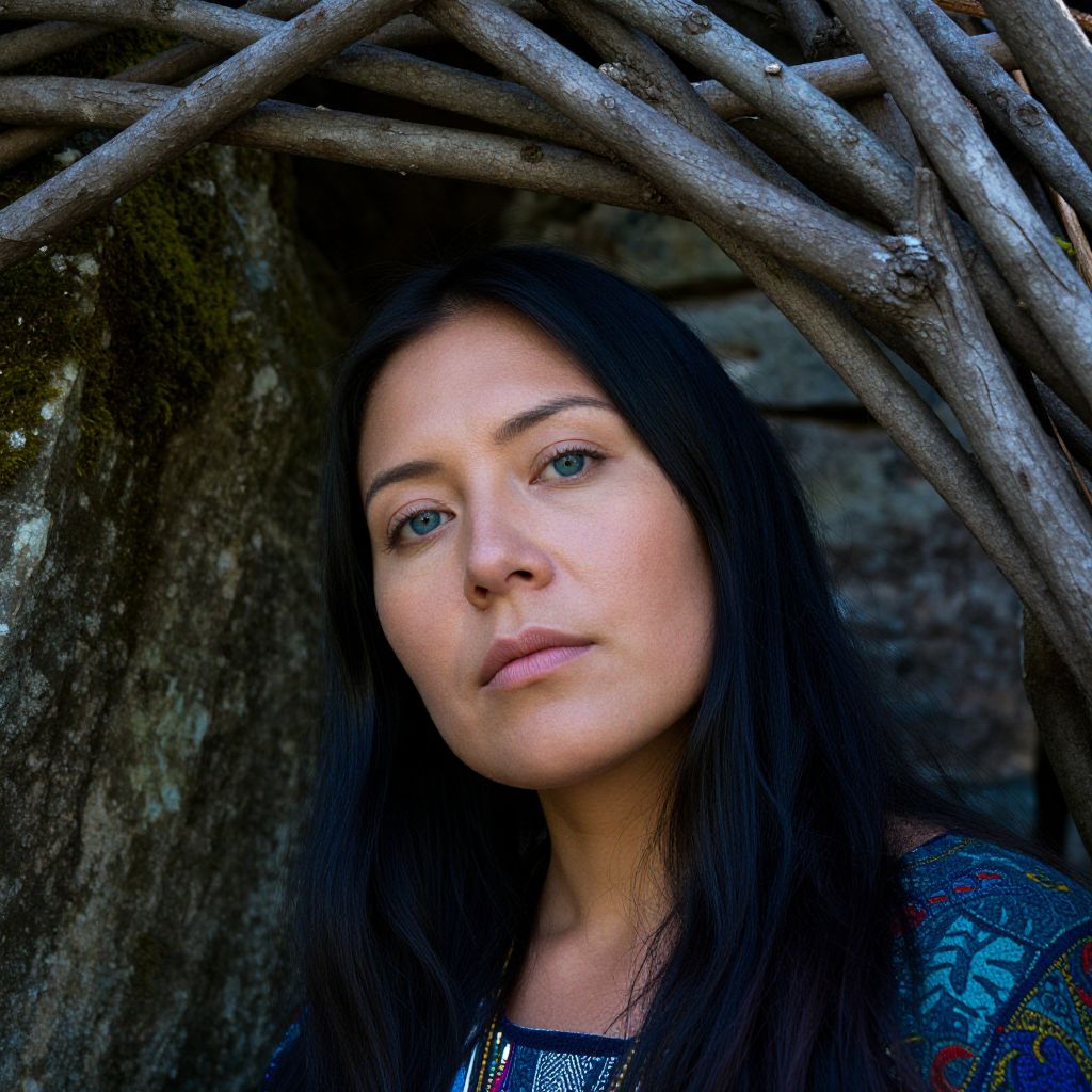 A portrait photograph of a serene Native American woman in her late twenties reveals striking blue eyes and porcelain skin illuminated by soft northern light filtering through an ancient archway of interwoven branches. Her expression conveys quiet intensity as she thoughtfully gazes at the camera from a unique low-angle perspective, showcasing fine features and lush raven hair cascading over one shoulder. Set against an ancient stone wall adorned with vibrant moss and lichen, this portrait evokes timeless beauty and introspection, inviting exploration into the captivating depth and complexity of her visage.