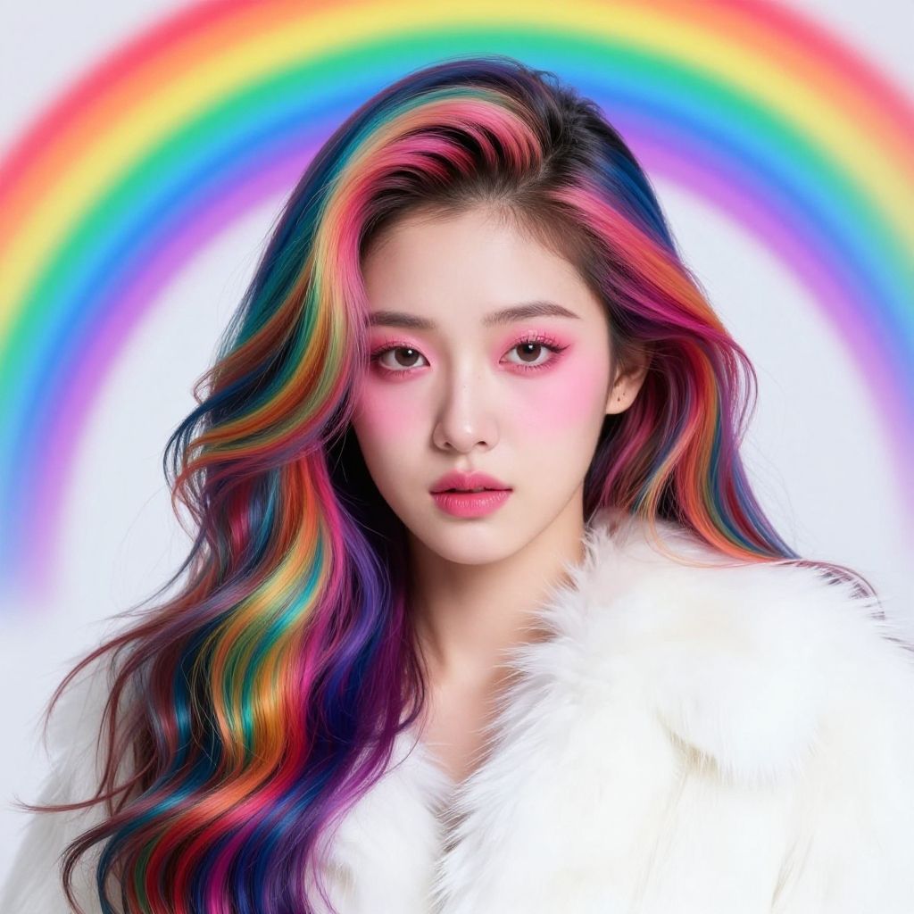 Photograph-style digital illustration of a young woman with long, wavy hair featuring a vibrant rainbow of pink, purple, blue, and orange hues. She has fair skin, full lips with nude lipstick, and defined eyebrows. Her eyes are accentuated with dramatic, smoky eye makeup. She wears a white, fluffy fur coat that contrasts with the bright pink background. Her expression is neutral, with a slight, confident gaze. The image has a high-contrast, vivid color palette and a smooth, polished texture, emphasizing the striking colors and details of her hair and makeup.