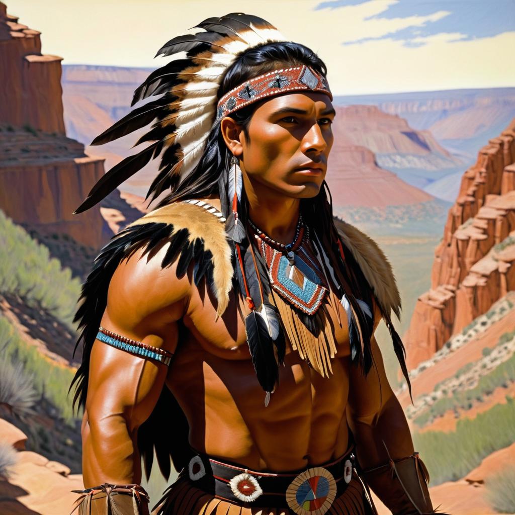 A muscular man dressed in detailed tribal warrior clothing with necklaces and arm bands, standing in a vast desert with sand dunes under a clear sky, warm natural lighting highlighting textured fabrics and skin, earthy tones with rustic brown and beige colors, tribal rustic style
