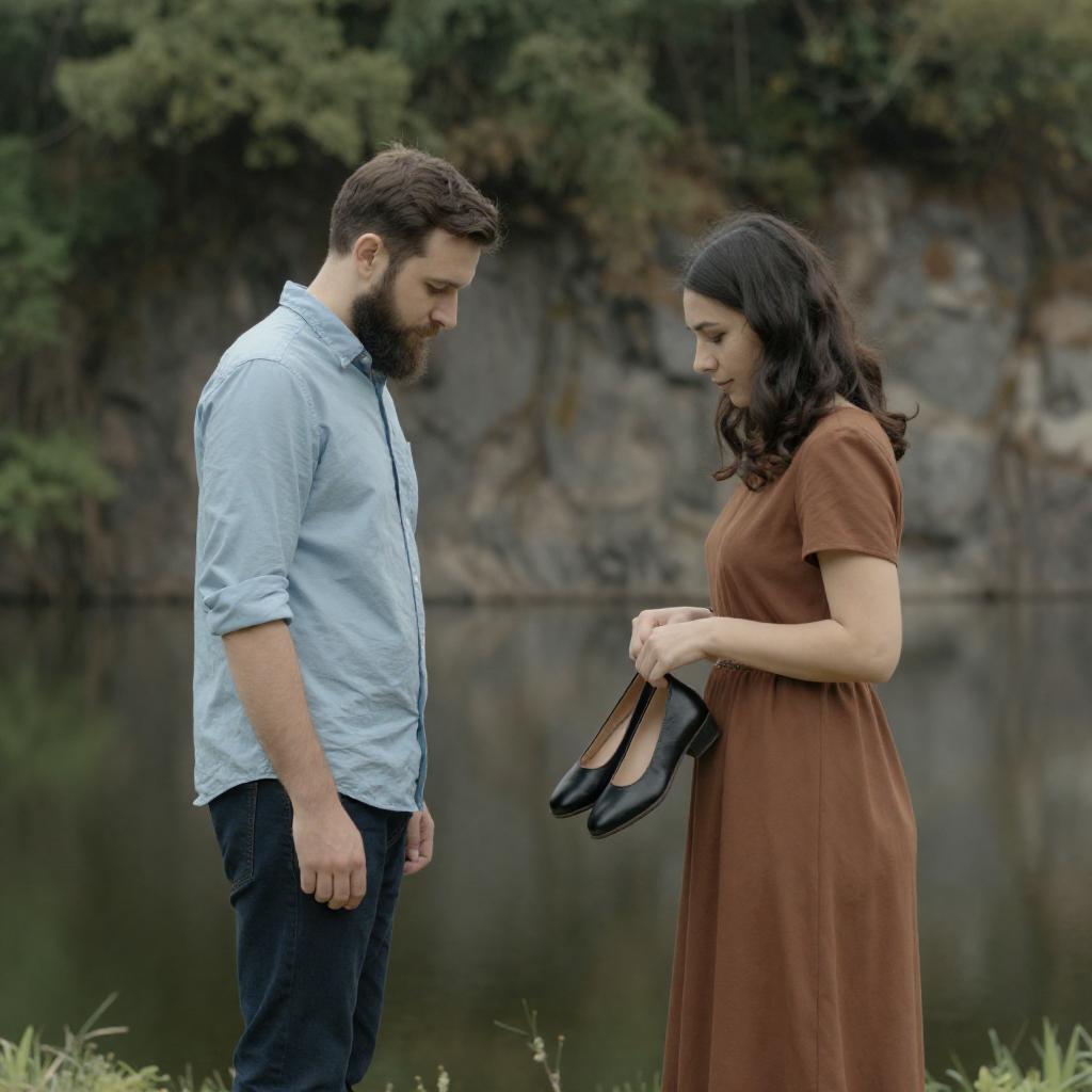 Photograph of a bearded man in a light blue shirt and dark pants, standing to the left, looking at a woman in a brown dress holding shoes, standing to the right. Both look down, near a calm lake with rocky cliffs and dense green trees in the background.