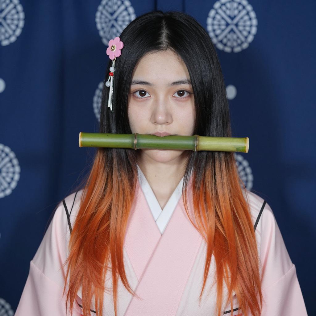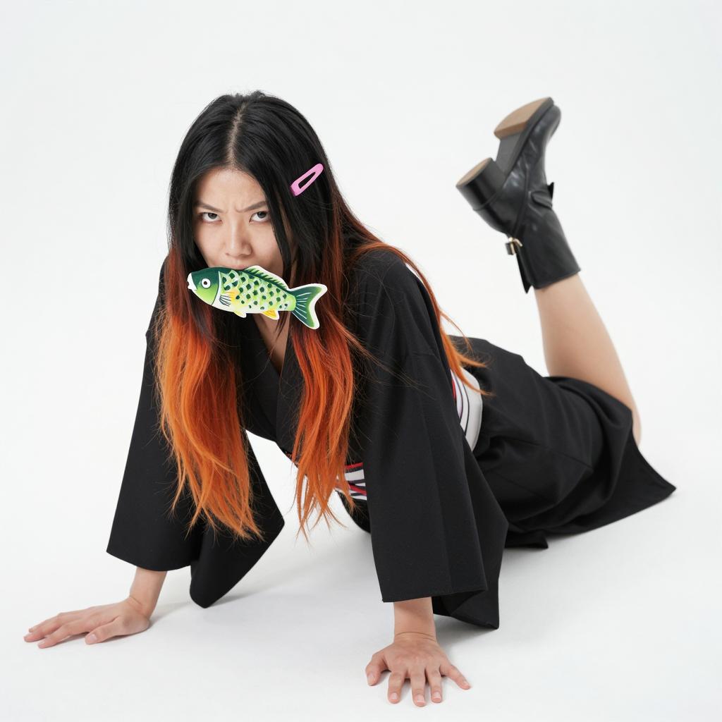 Asian woman with long black-to-orange ombre hair, black kimono, pink hair clip, green fish-shaped mouth gag, crawling on white floor. Black boots, outstretched arm, intense expression, white background. Studio photograph, realistic style. Single person.