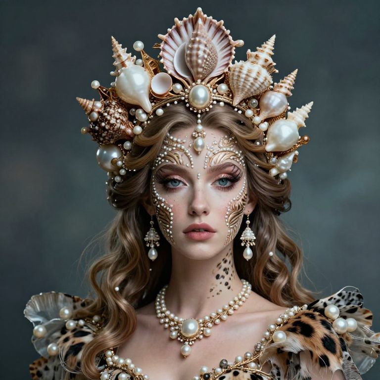 Animal Print a beautiful sea queen with intricate face highly detailed dress and ornate crown made out of shells and pearls, 16K, whimsical, ethereal, magical, Anna Dittmann, Daniel Gerhartz,