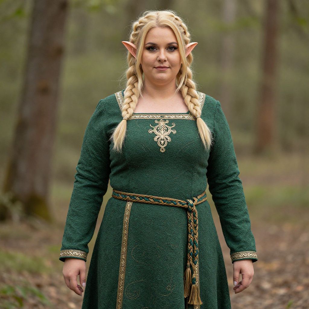 A confident plus-size woman stands in a forest wearing a detailed green medieval-inspired costume featuring long sleeves, intricate gold embroidery, and a braided belt. Her blonde hair is styled in two braids, and she wears pointed elf-like ears, creating a fantasy and cosplay aesthetic.