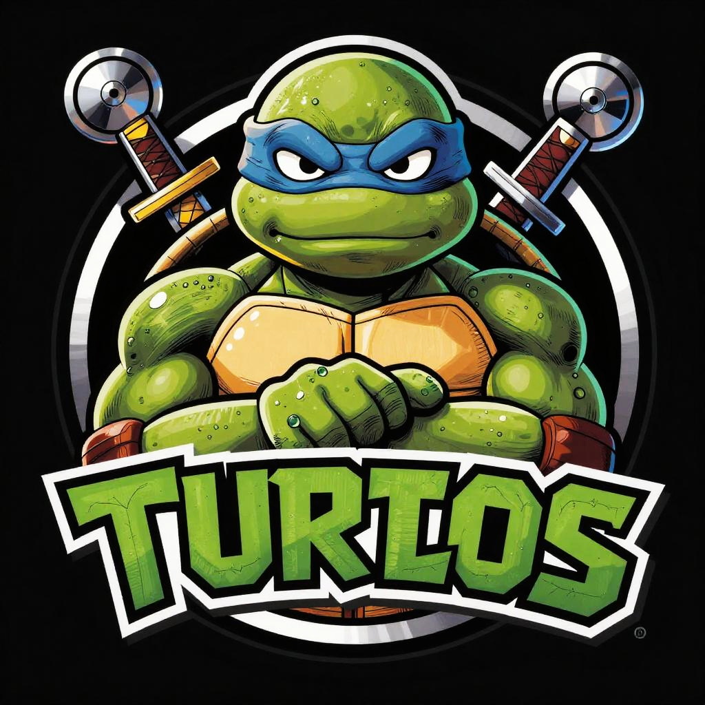 Ninja Turtles logo generator inspired by classic comic art, detailed turtle face with fierce expression, layered lettering around the emblem, sharp metallic textures on weapons, vibrant greens and yellows with black outlines, dynamic and eye-catching logo style