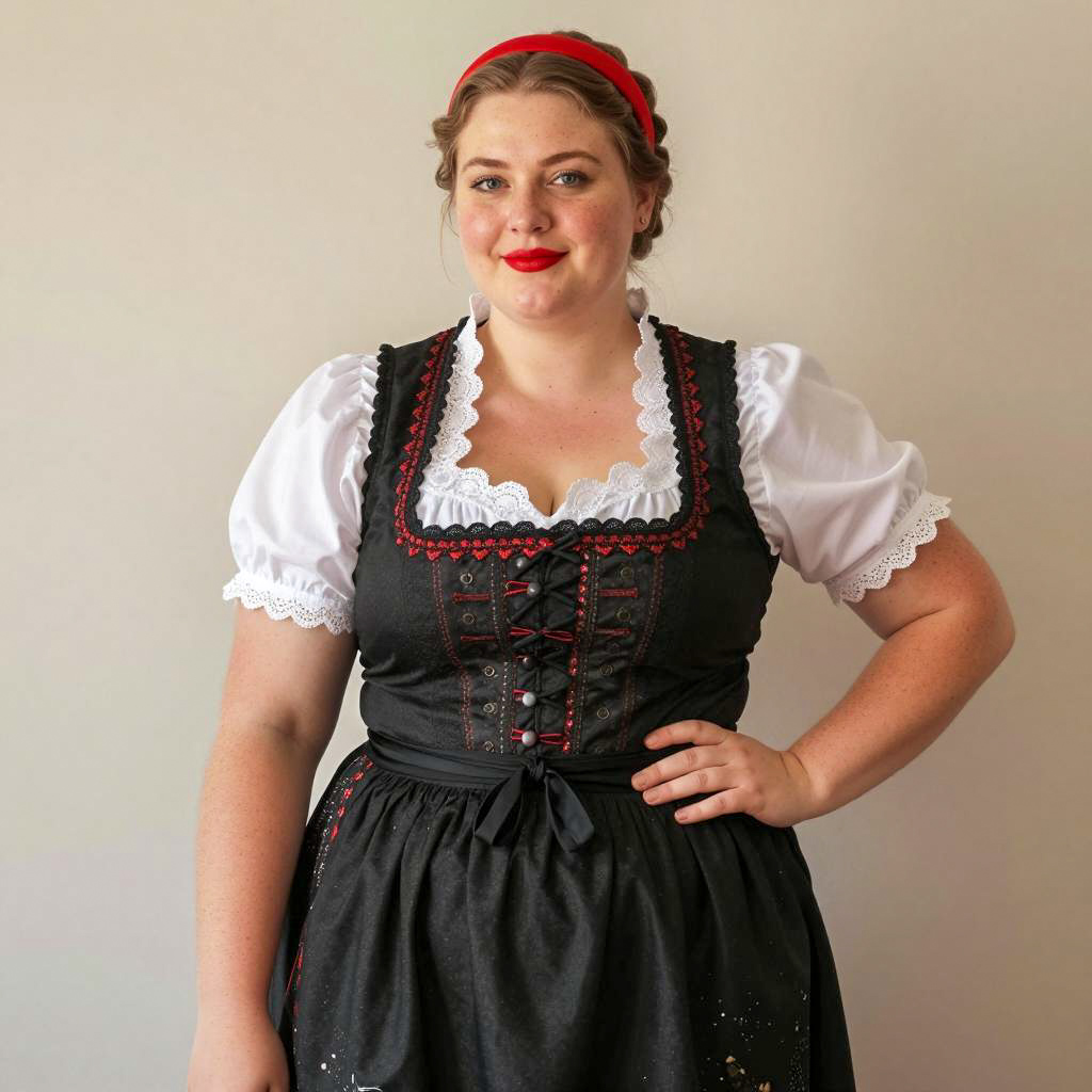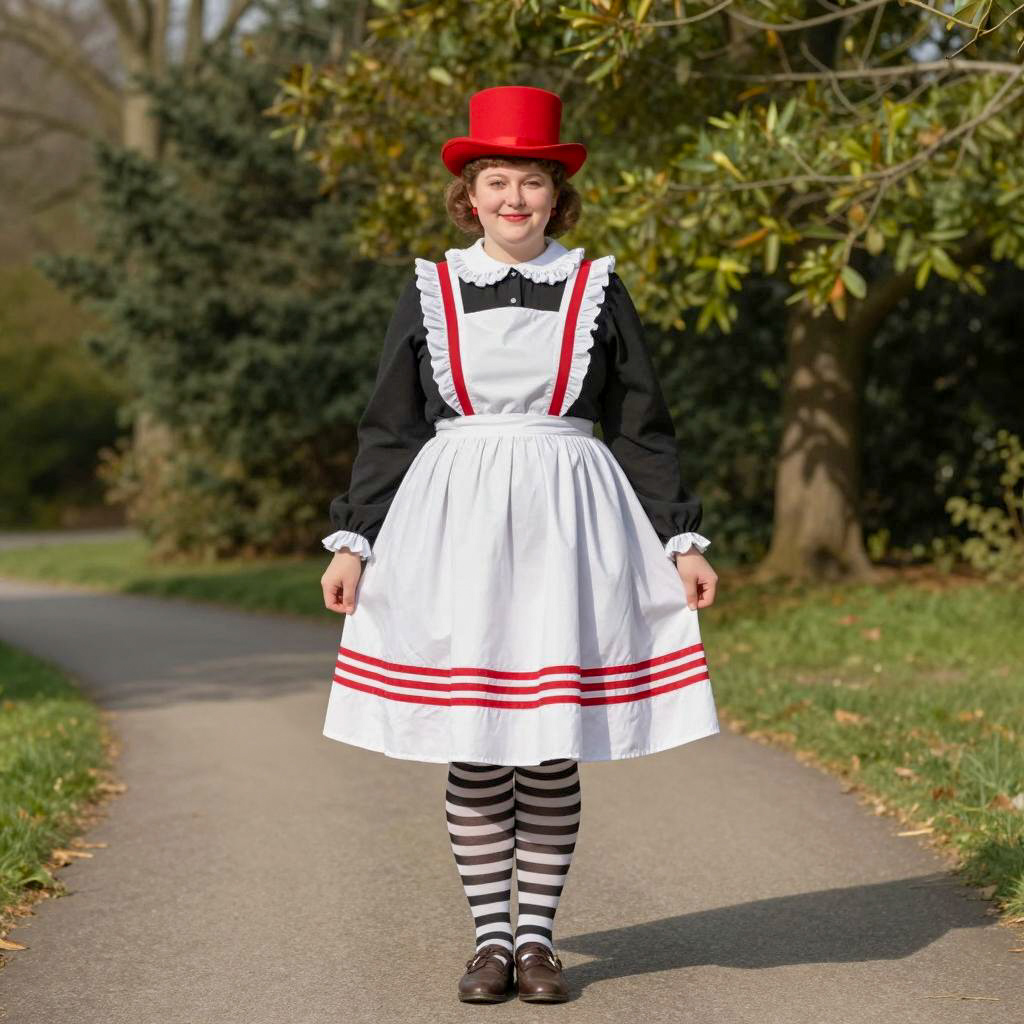 Adult plus size vintage, photograph of a person standing on a paved path, daytime, wearing a red top hat, black long-sleeve shirt, white pinafore dress with red stripes, black and white striped stockings, brown shoes, white ruffled collar, green trees and bushes in the background, sunny, slightly blurred background, realistic style, full body shot, smiling