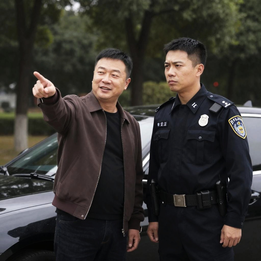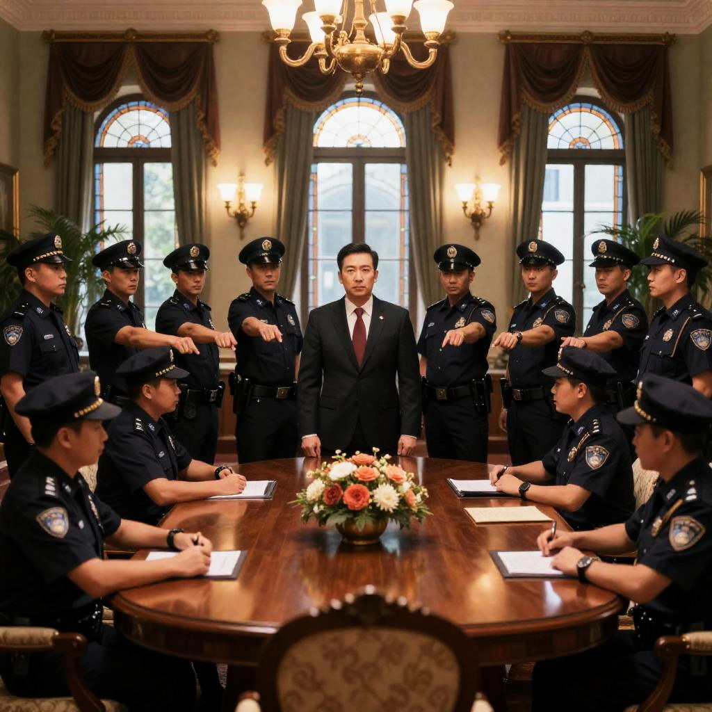 Photograph of a formal meeting in an ornate room. Central man in dark suit, white shirt, red tie, surrounded by 14 police officers in uniform. Officers pointing at him, intense expressions. Large wooden table with floral centerpiece, patterned chairs. Potted plants, stained glass windows, and rich drapery in background.
