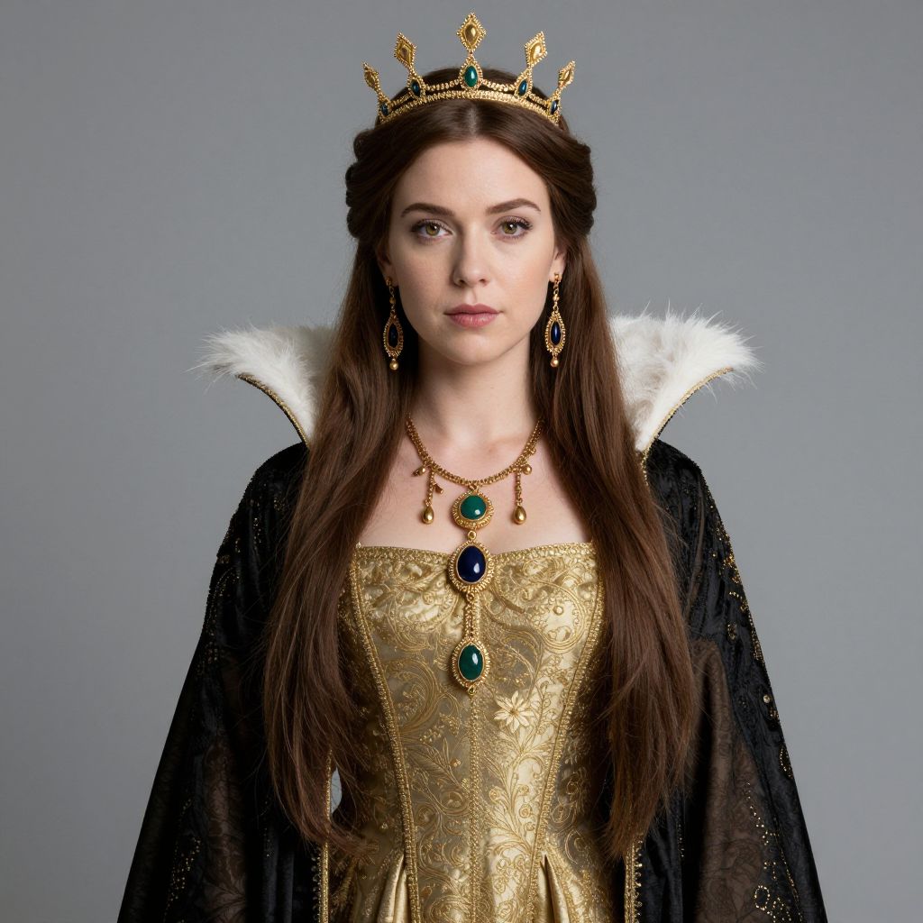 Queen esther woman costume, 1girl, solo, looking at viewer, jewelry, brown hair, dress, earrings, long hair, standing, closed mouth