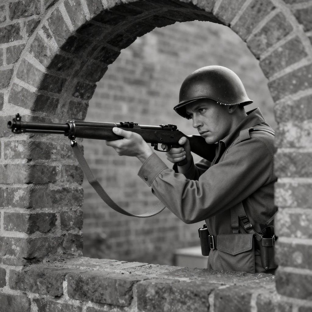 Black-and-white photograph of three World War II soldiers in a grassy field, crouching low and pointing forward. They wear steel helmets and military uniforms, with focused expressions. The soldier in the foreground has a serious look, while the others appear alert. The grass is uneven and wild, adding ure to the scene.