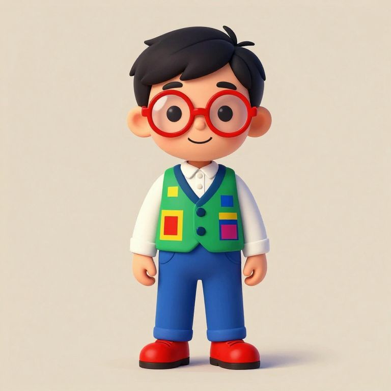 This is a digital, cartoon-style illustration of a young boy with large, round, red glasses and short black hair. He wears a white shirt with a green vest that has colorful pockets (yellow, red, blue, and purple) and blue pants. His shoes are bright red. The boy has a cute, smiling face with a small black nose and rosy cheeks. The background is plain white, making the colorful character stand out prominently. The illustration has a smooth, polished, and vibrant aesthetic with bold, solid colors and simple, rounded shapes.