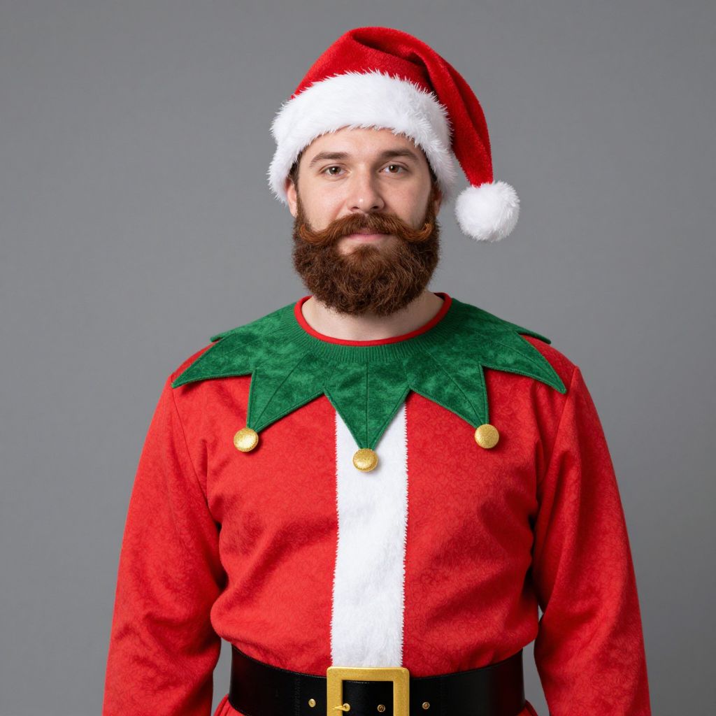 Photograph of a bearded man with a Santa hat, wearing a red Christmas sweater with green elf-like shoulders and a black belt. Gray background.