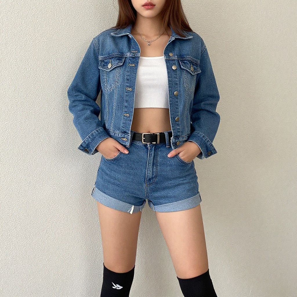 Portrait of a young Asian woman wearing a light blue cropped V-neck T-shirt with short sleeves and mid-rise faded wash blue denim jeans. She accessorizes with a long circular pendant necklace, a delicate gold bracelet, and a wristwatch. The woman poses against a beige wall with natural light casting shadows.