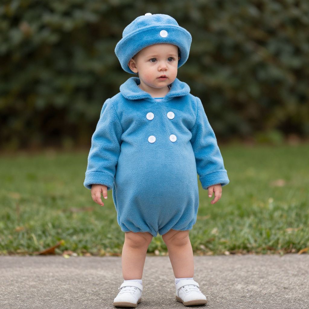 Photograph of a toddler standing on a sidewalk, wearing a blue, plush, hooded onesie with white buttons and a matching blue hat with white polka dots. The child has fair skin, short dark hair, and is looking slightly to the right. The onesie is fuzzy and slightly oversized, covering the child's legs and ending just above the knees. The child is also wearing white sneakers. The background features a blurred green lawn and dark green, leafy bushes, providing a natural setting. The toddler's expression is neutral, and the overall scene is brightly lit with natural daylight.