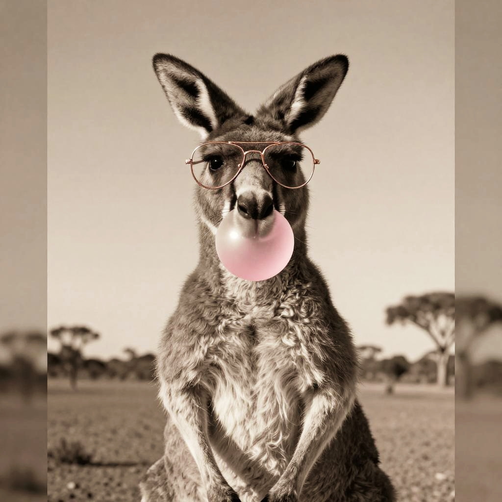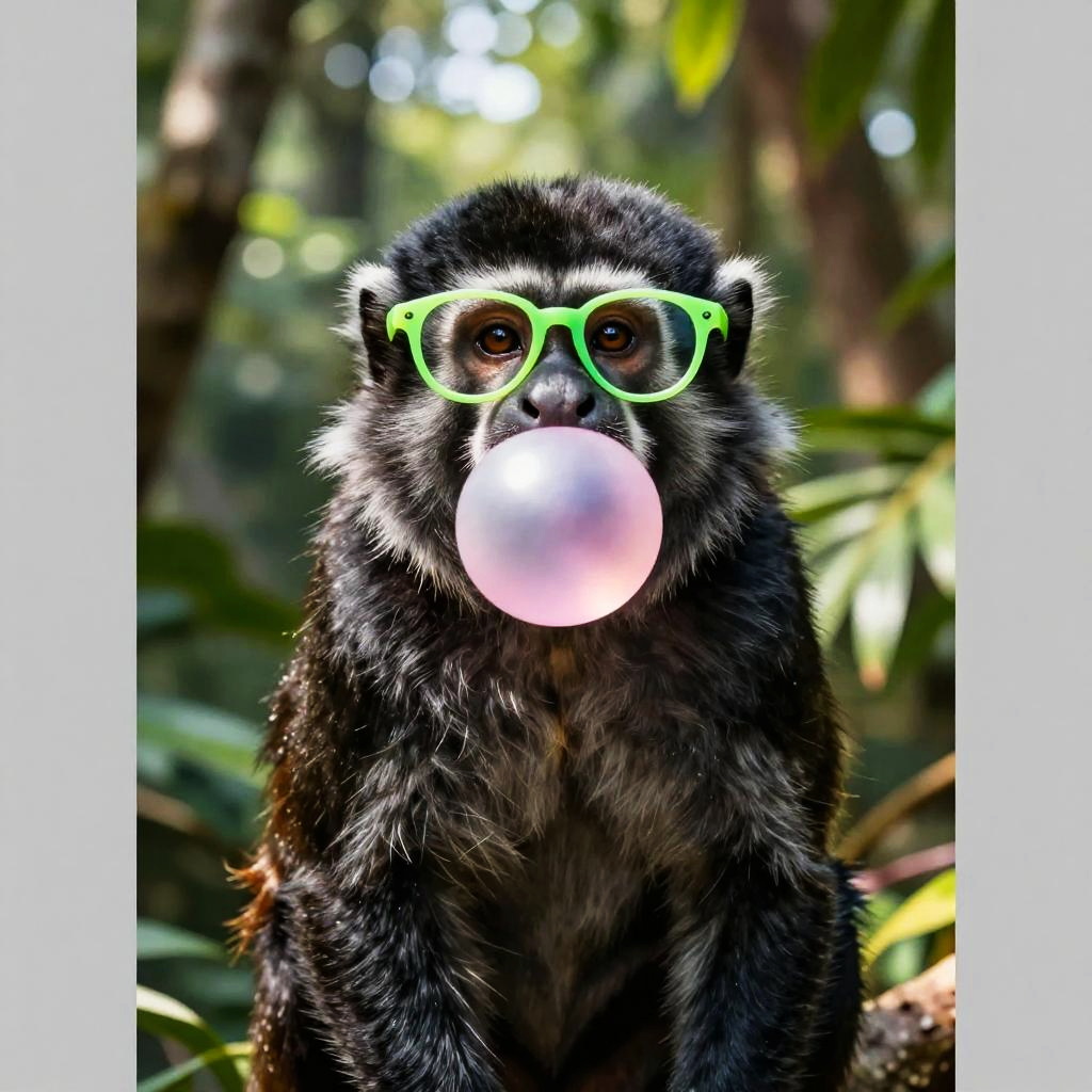 Holographic print of a pheasant with shimmering amethyst horn-rimmed glasses in iridescent marshland under a glowing twilight. The subject blows a large pink bubblegum bubble; muted pastel palette, calm focused expression. Playful surreal vibe, subtle gray vertical borders on both sides, crisp detail, rim lighting on whiskers, glossy reflections, saturated contrast, studio clarity, light film grain, shallow depth of field, slight vignette, clean background, centered composition.