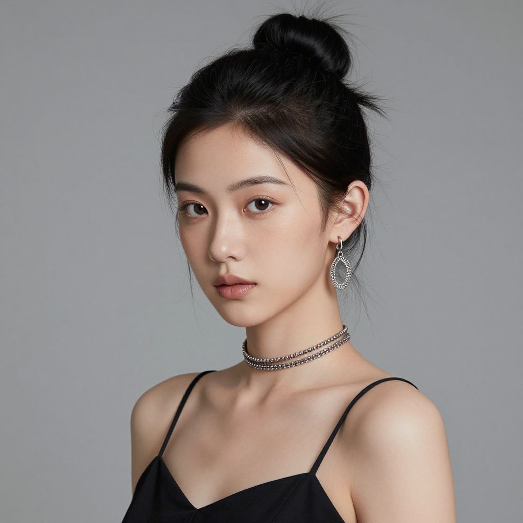 Photograph of an East Asian woman with long, straight black hair, fair skin, and neutral expression, wearing a black strapless top, against a