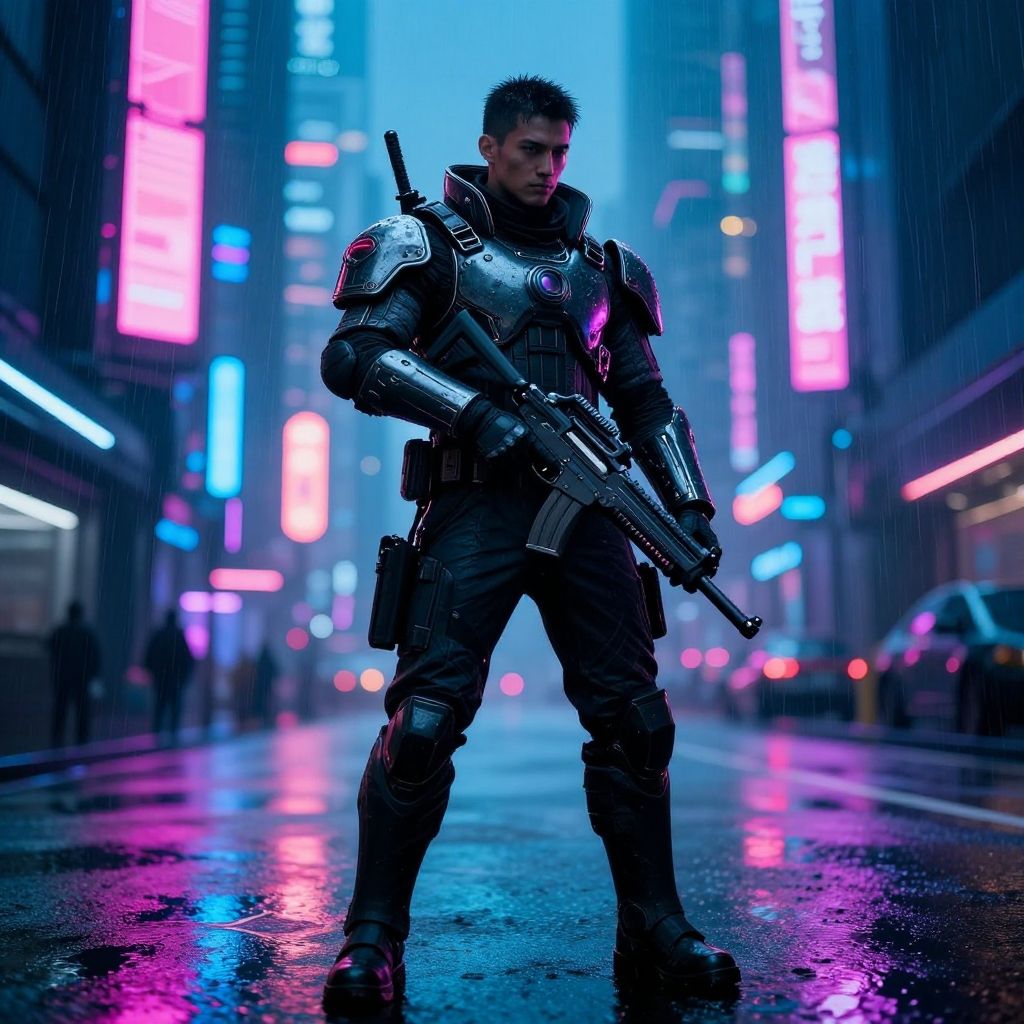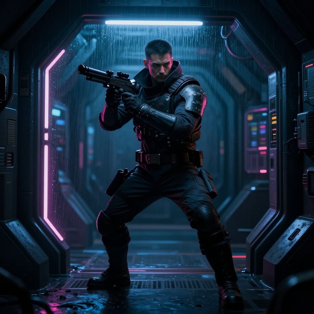 Cyberpunk photo: Intense male soldier in black tactical gear, holding a gun, standing in a neon-lit, rain-filled, futuristic corridor