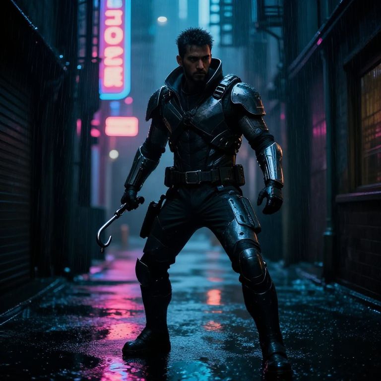Cyberpunk mercenary poised for battle inside a high-tech underground bunker, vivid neon lights highlighting metallic surfaces, rain streaks on glass, emphasizing gritty futuristic aesthetics