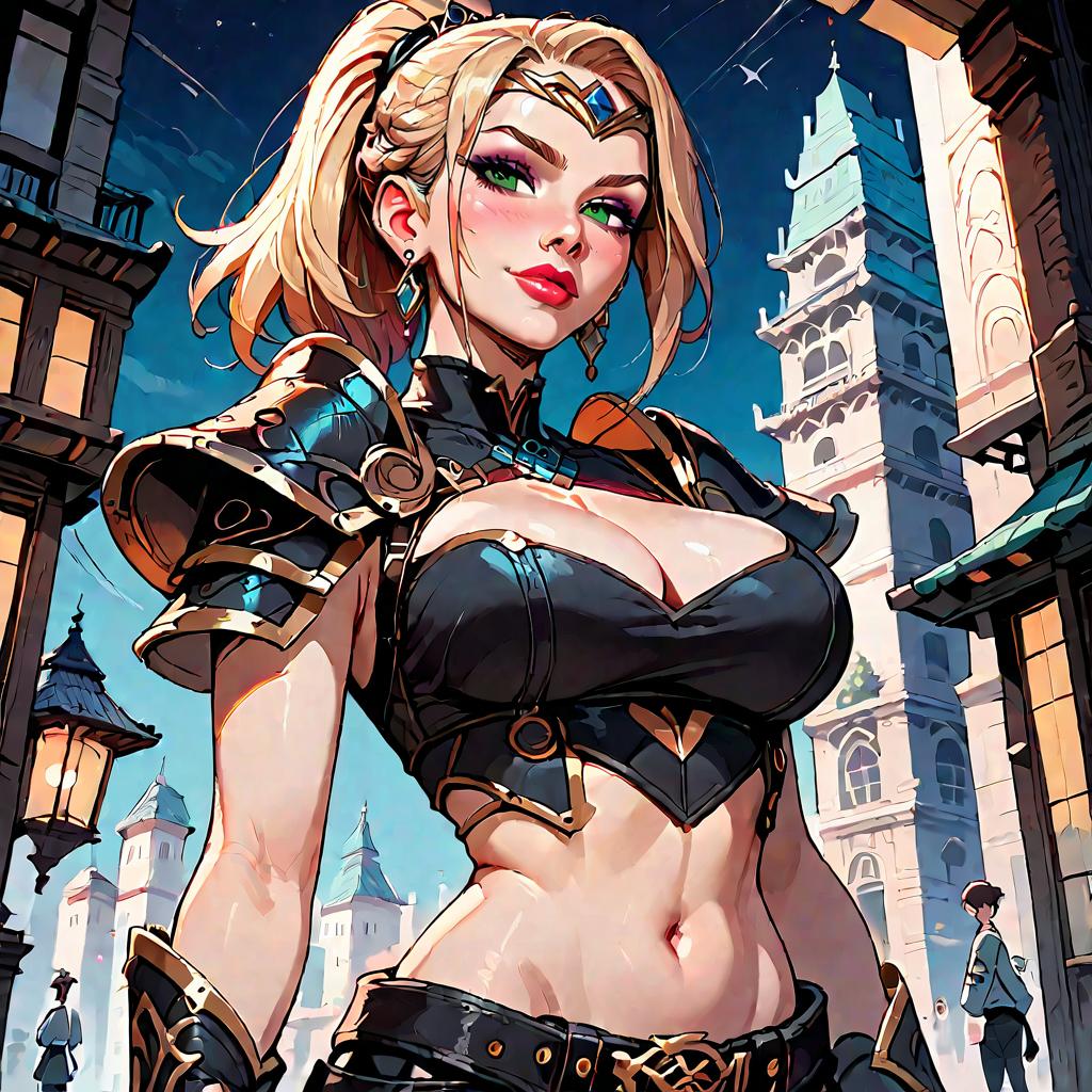 Score_9, score_8_up, source_anime, 1girl, blonde hair, blue headband, green leotard, white cape, shoulder pads, bracelets, cleavage, thigh boots, white boots, holding sword, fighting stance, serious, forest, blue sky