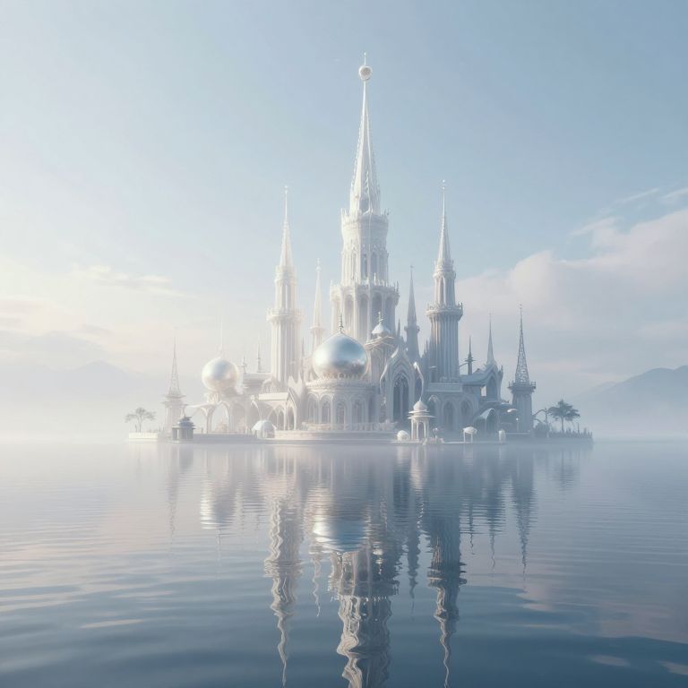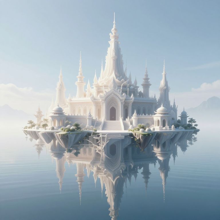 A surreal 3D-rendered fantasy landscape features a floating island adorned with intricate, dreamlike temples and spires, their ethereal forms reflected perfectly in the tranquil waters below, evoking a sense of otherworldly serenity and the artistic vision of a city built from the condensation of dreams.