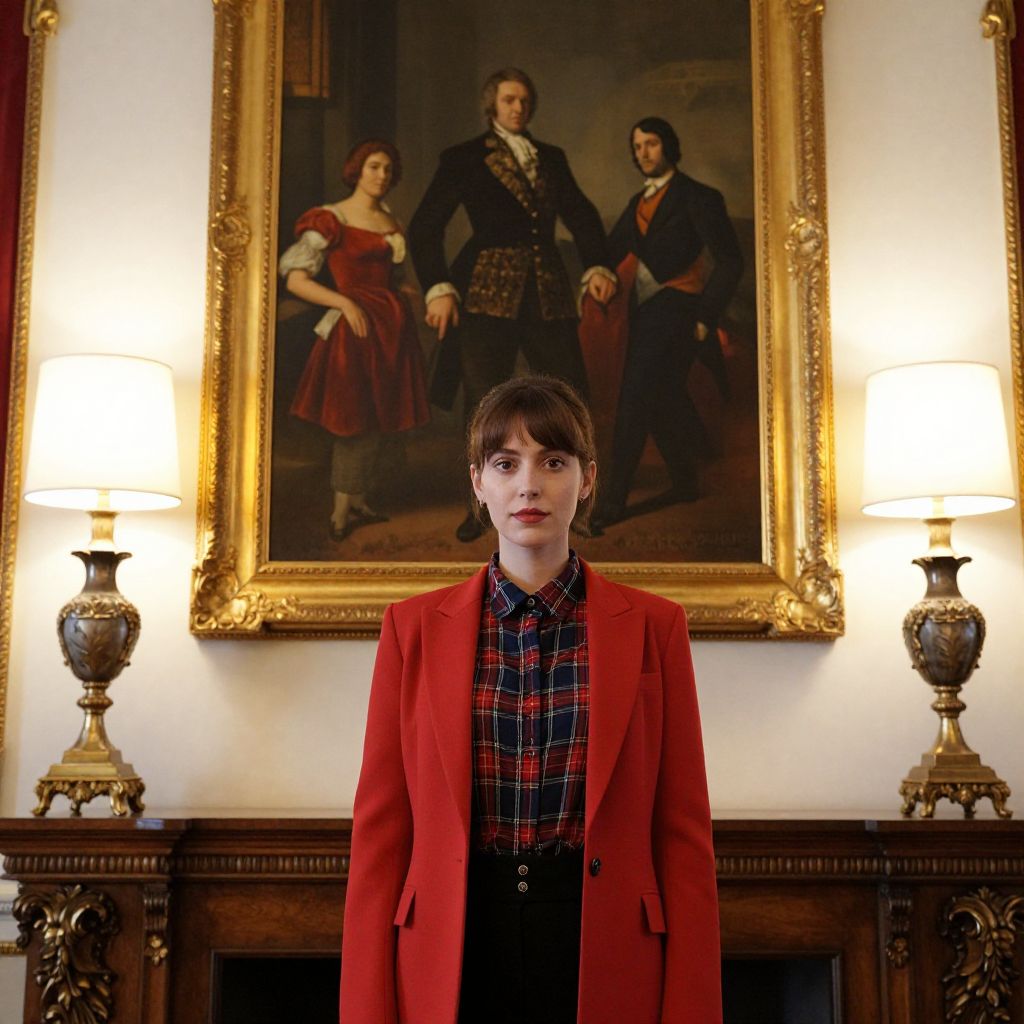 Woman standing confidently in a luxurious room, wearing a vibrant red blazer over a plaid shirt, framed by two ornate lamps and a grand portrait depicting three figures in historical attire above a dark wooden mantelpiece.