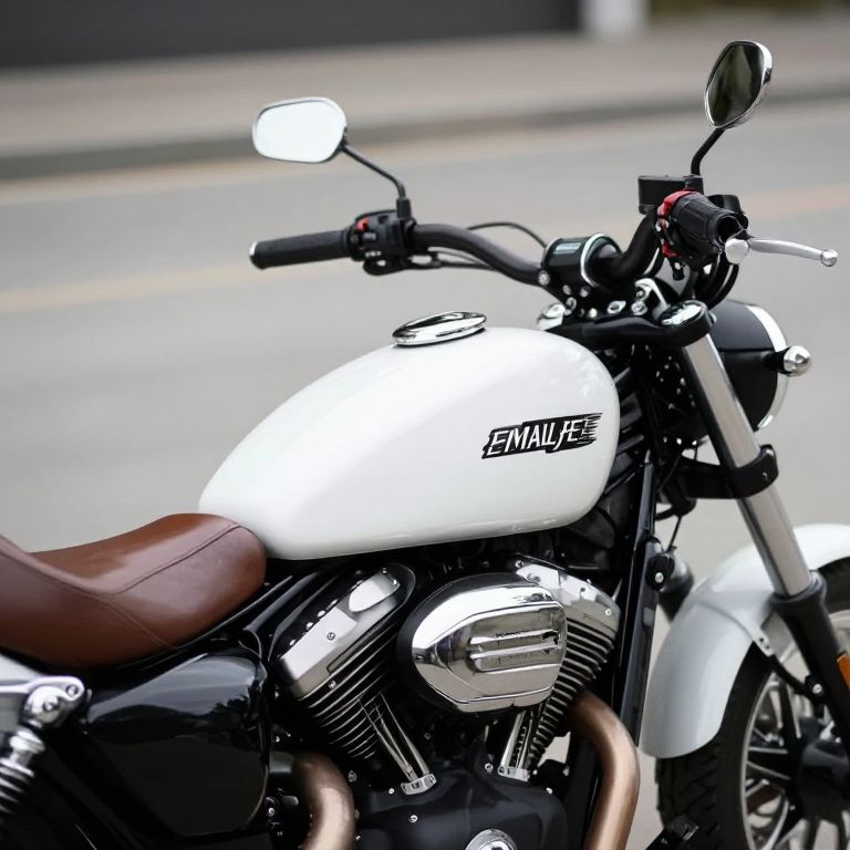 Stylish cruiser motorcycle featuring a white fuel tank with a bold logo, brown leather seat, dual mirrors, and chrome accents, showcasing a classic yet modern design.