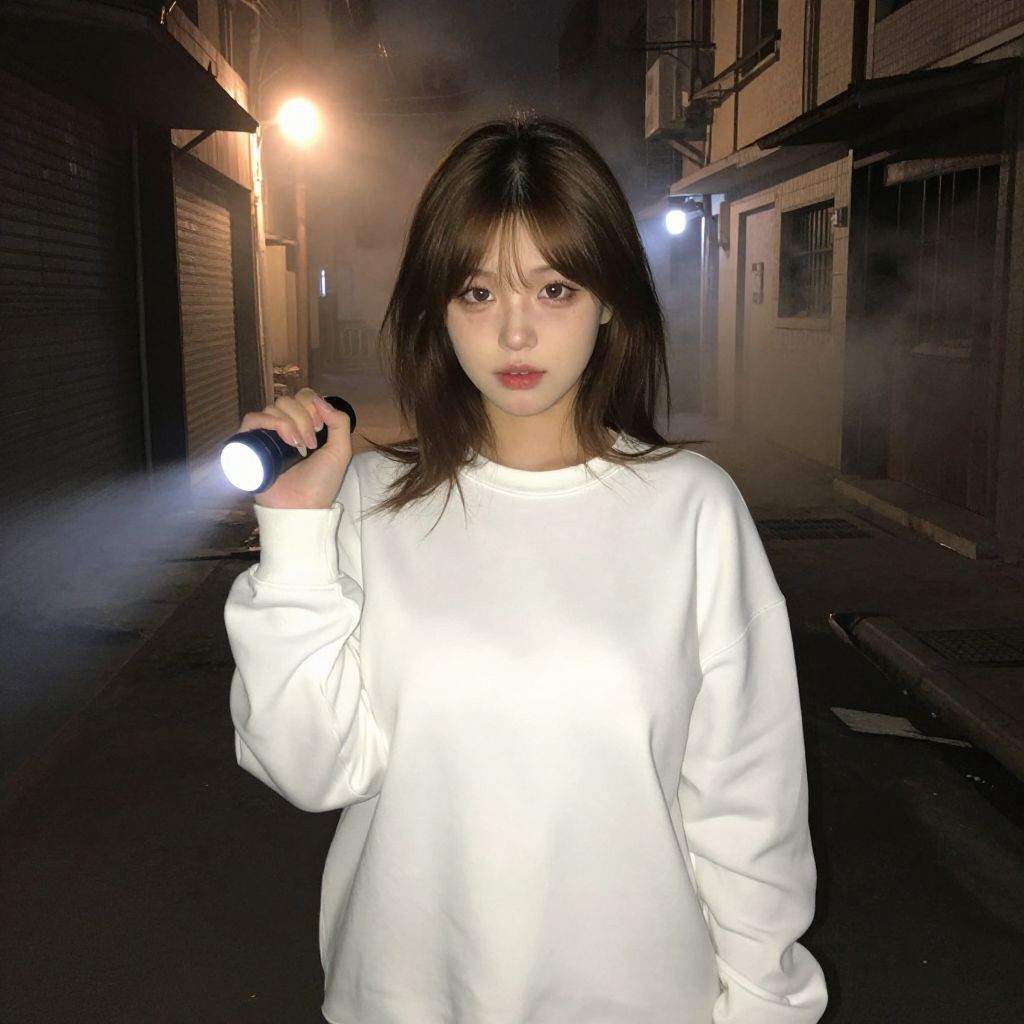 Young Asian woman with straight black hair, wearing a white sweatshirt, holding a flashlight in a dark, foggy alleyway at night.