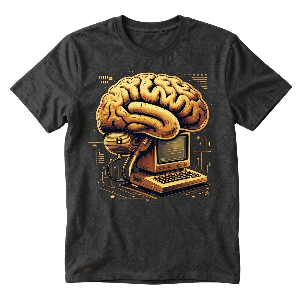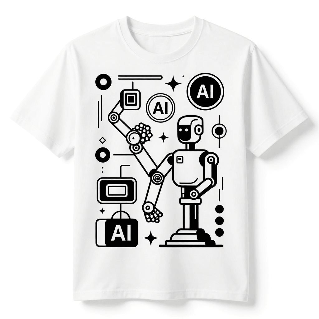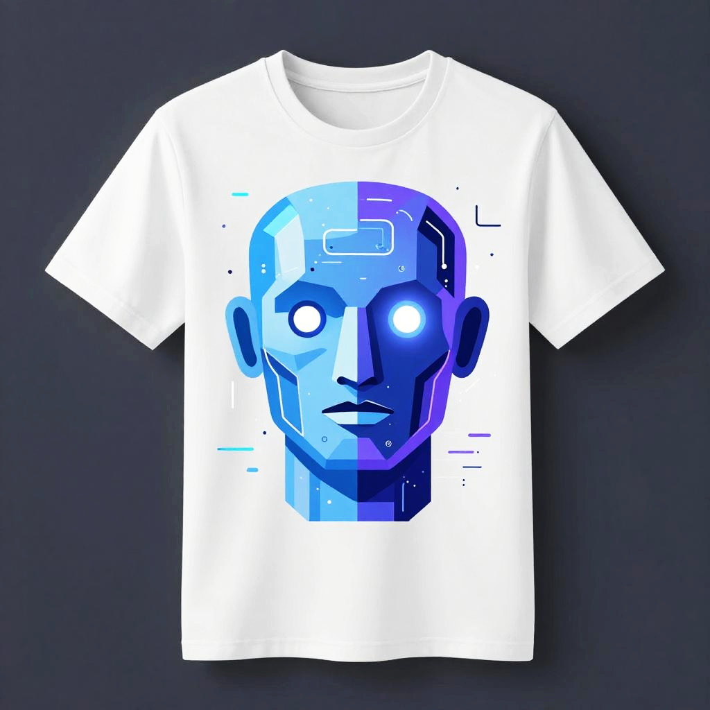 AI t-shirt design generator free, stylized robotic head surrounded by swirling data streams and pixelated elements in bright blues and purples, cyberpunk vibes, intricate linework and smooth gradients, perfect for innovative and modern graphic tee designs
