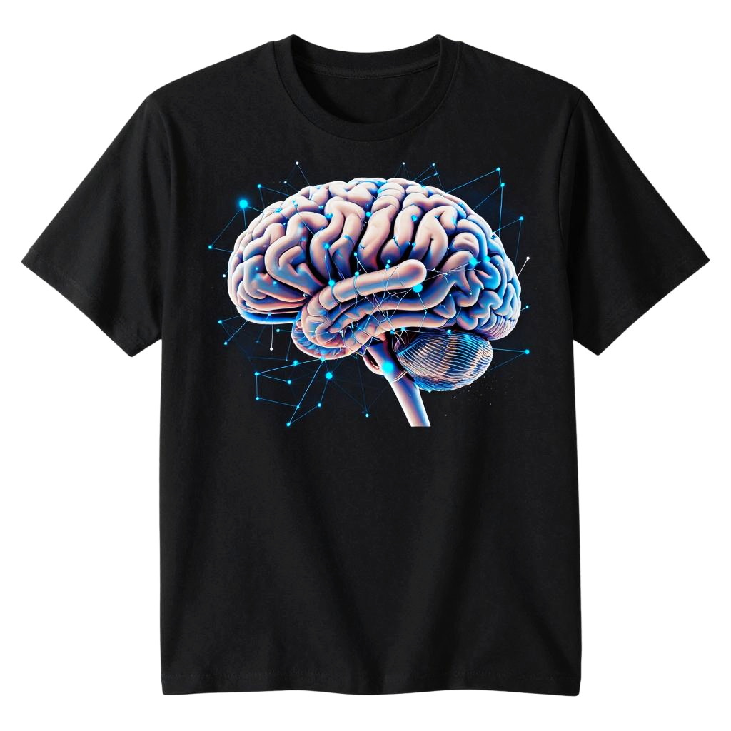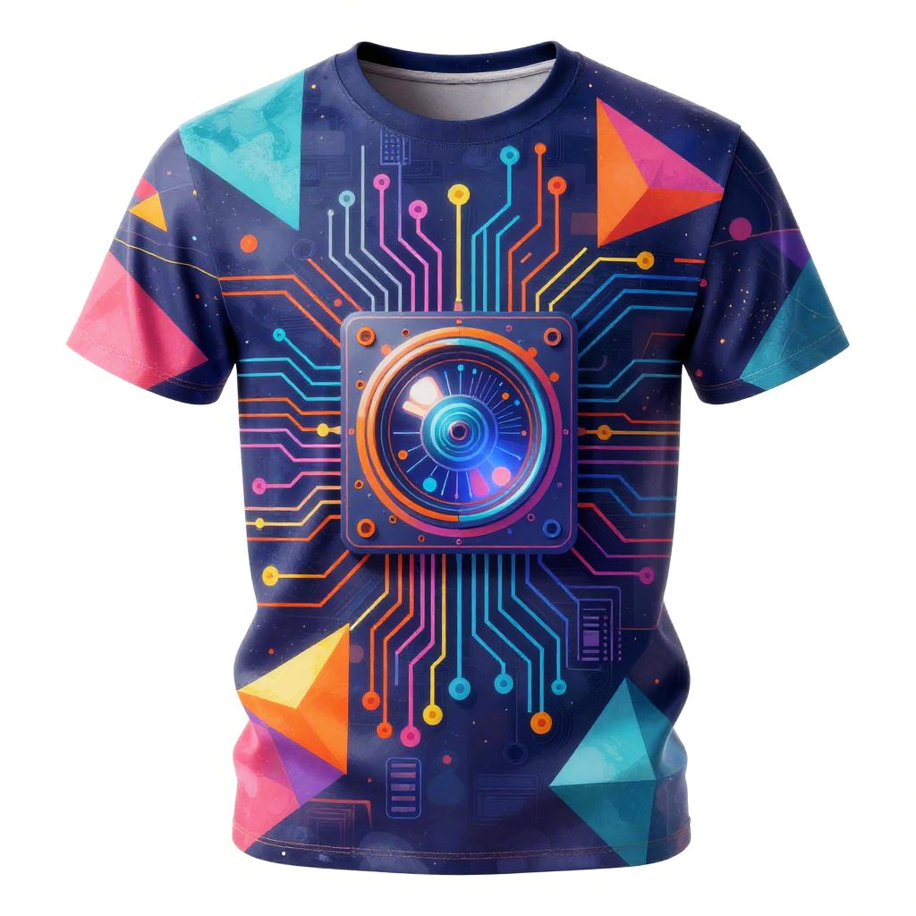 Photograph of a white t-shirt featuring a digital, glowing blue and purple cyber-head portrait with futuristic lines and swirls.
