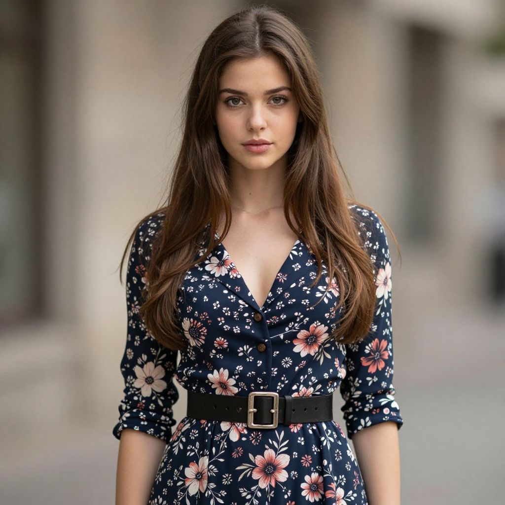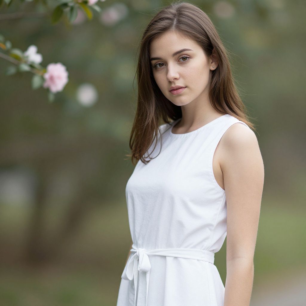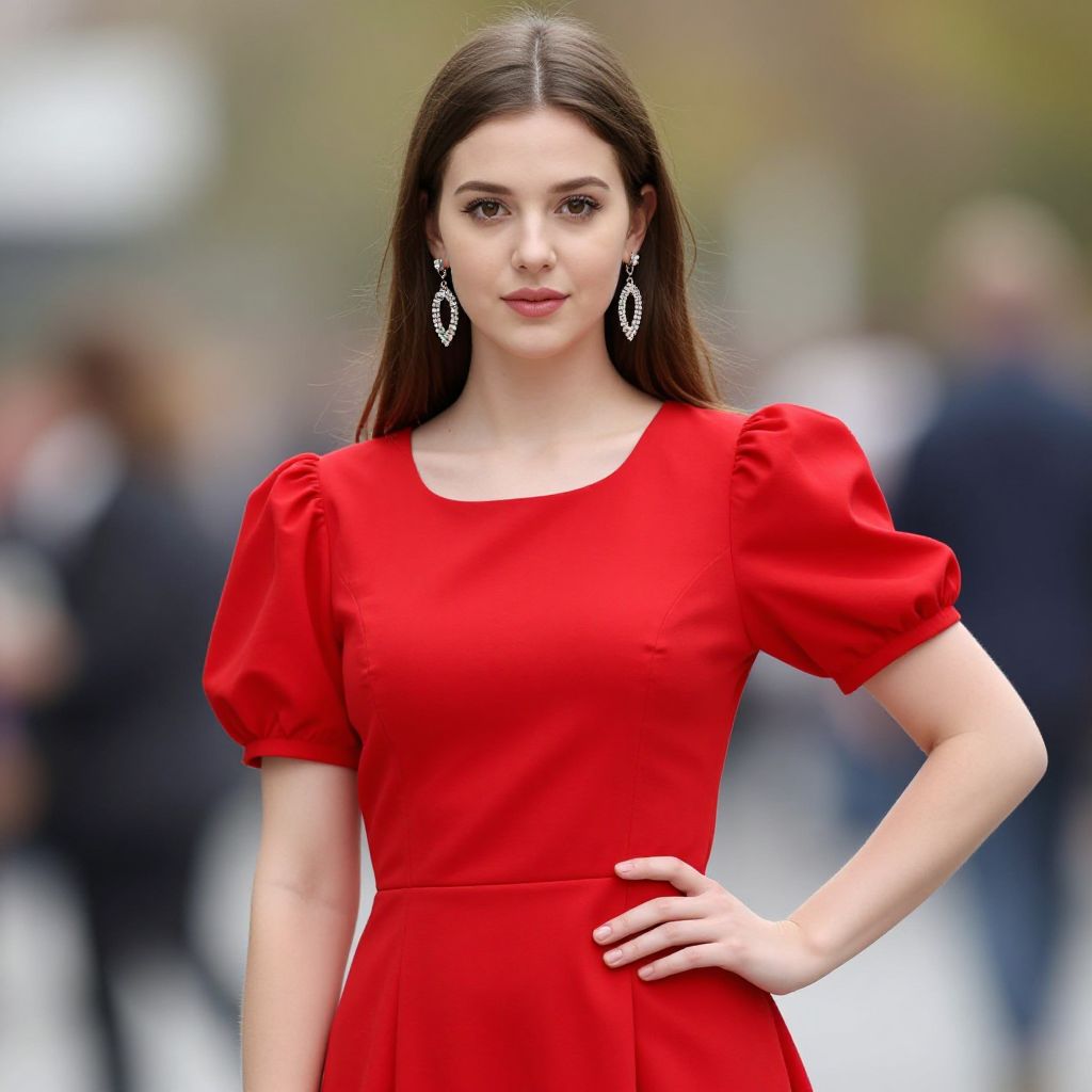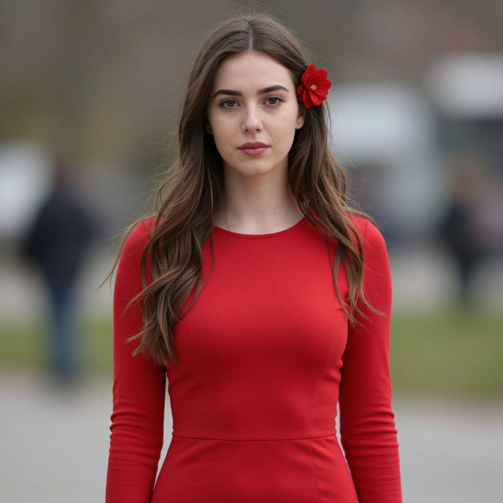 "red dress winter, 1girl, solo, long hair, dress, flower, red dress, brown hair, realistic, blurry, blurry background, outdoors, long sleeves Realistic photo of casual sexy person with pretty face"
