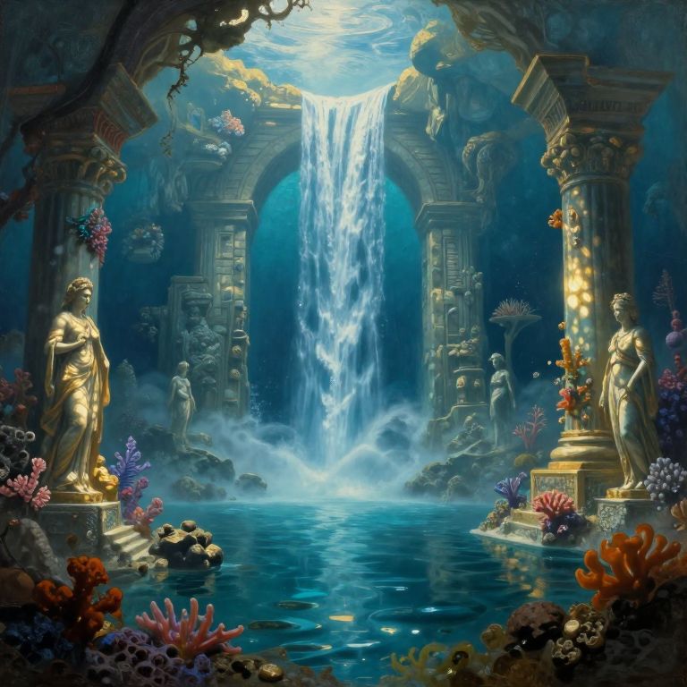 An oil painting masterpiece captures an otherworldly underwater realm where a forgotten city rests beneath shimmering azure waters. The city's architectural wonders are adorned with iridescent coral and bathed in soft golden light filtering through the depths, casting dappled shadows across weathered statues and crumbling columns. In the distance, a colossal stone gateway frames a majestic waterfall cascading from an azure cave high above the surface, its misty veil dancing gracefully over the tranquil waters below. The harmonious fusion of natural beauty and historical grandeur evokes reverence for the lost civilization and wonder at life thriving amidst the ruins, inviting viewers to explore the depths of history intertwined with oceanic mysteries and leaving a lingering sense of awe and fascination.