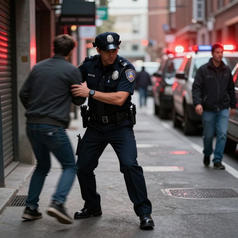 Police officer prompt: A dynamic image of a police officer in action, arresting a suspect in a downtown alley, with tension in the air, red lights flashing in the background, realistic textures, shadows, and motion blur, capturing a dramatic yet lawful confrontation in a modern urban environment.